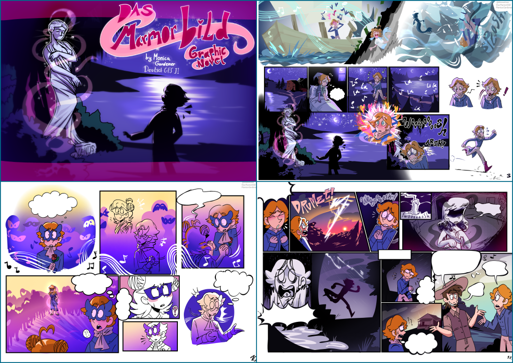 The next image, showcases the cover and a few example pages of “Das Marmorbild” an 18 page graphic novel adaptation project I did originally for class, of the novel “Das Marmorbild” (the Marble Statue in English) of Joseph von Eichendorff.